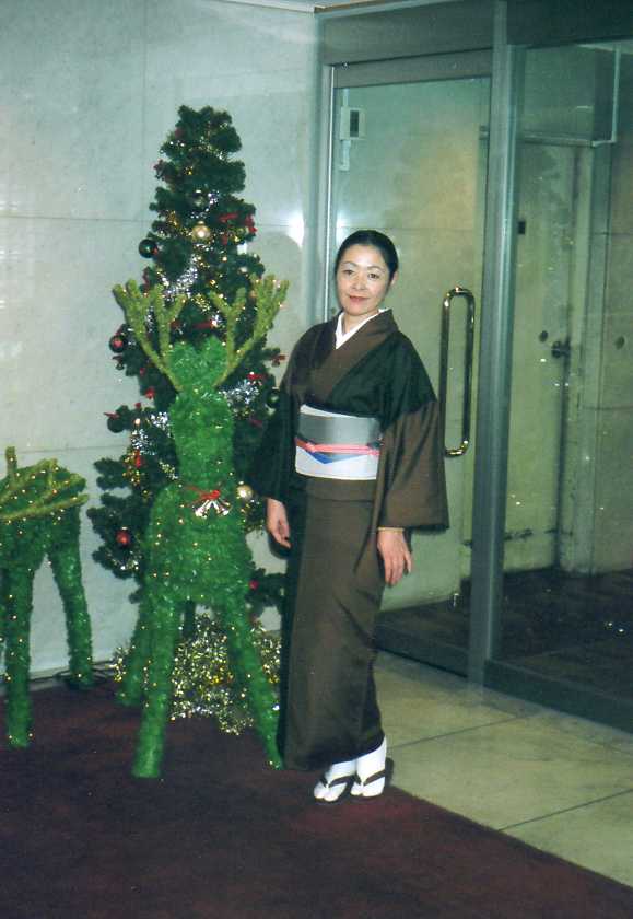 私の新聞エッセイの挿絵をよく描いてくれる沢登みよじ女史から気前よくいただいた着物で、大島とドクダミ染めの片身寄せ。彼女も着物の大ファンでよく粋に着こなしている。