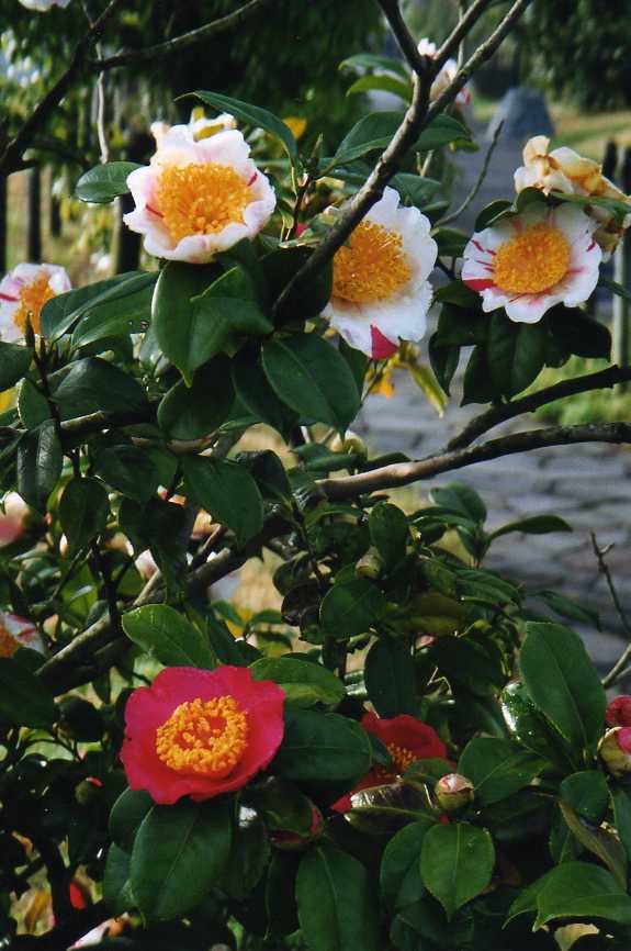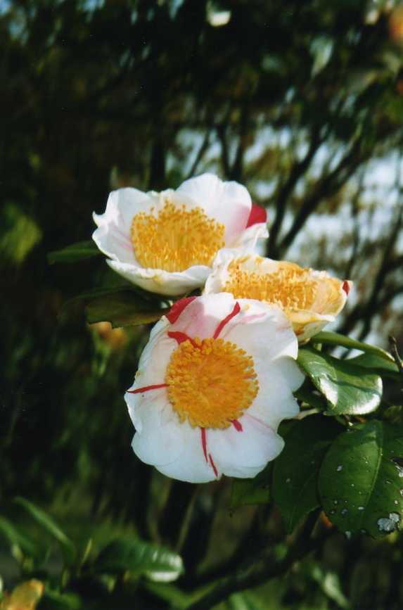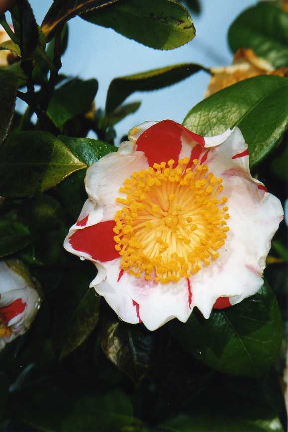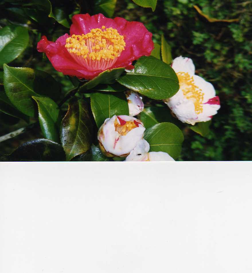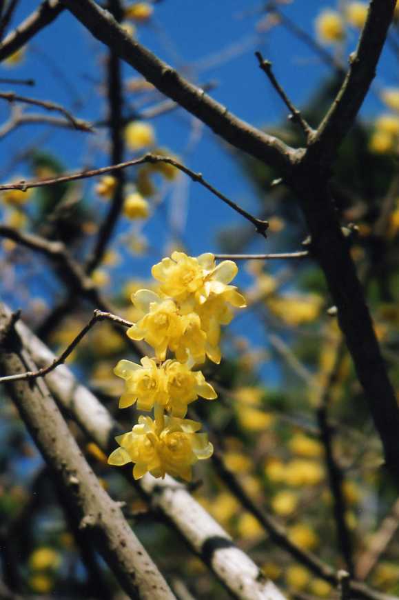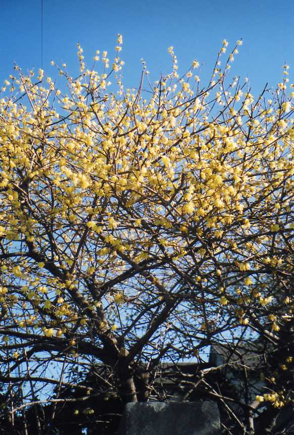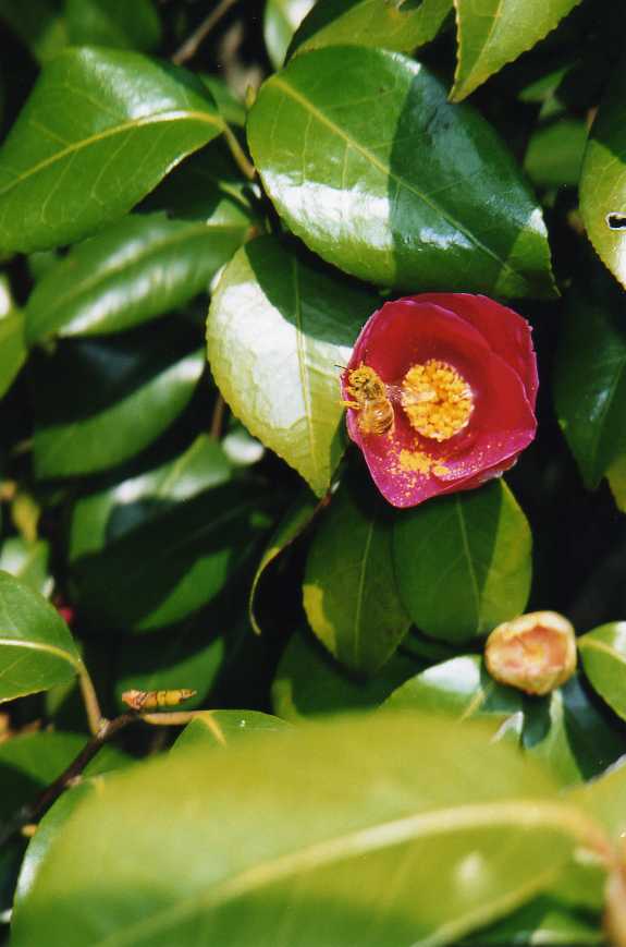 ヤブツバキの花の中に潜り込んで蜜を取りにいき、花粉だらけになって出てきたミツバチ。全身黄色の姿に、思わず笑ってしまう。