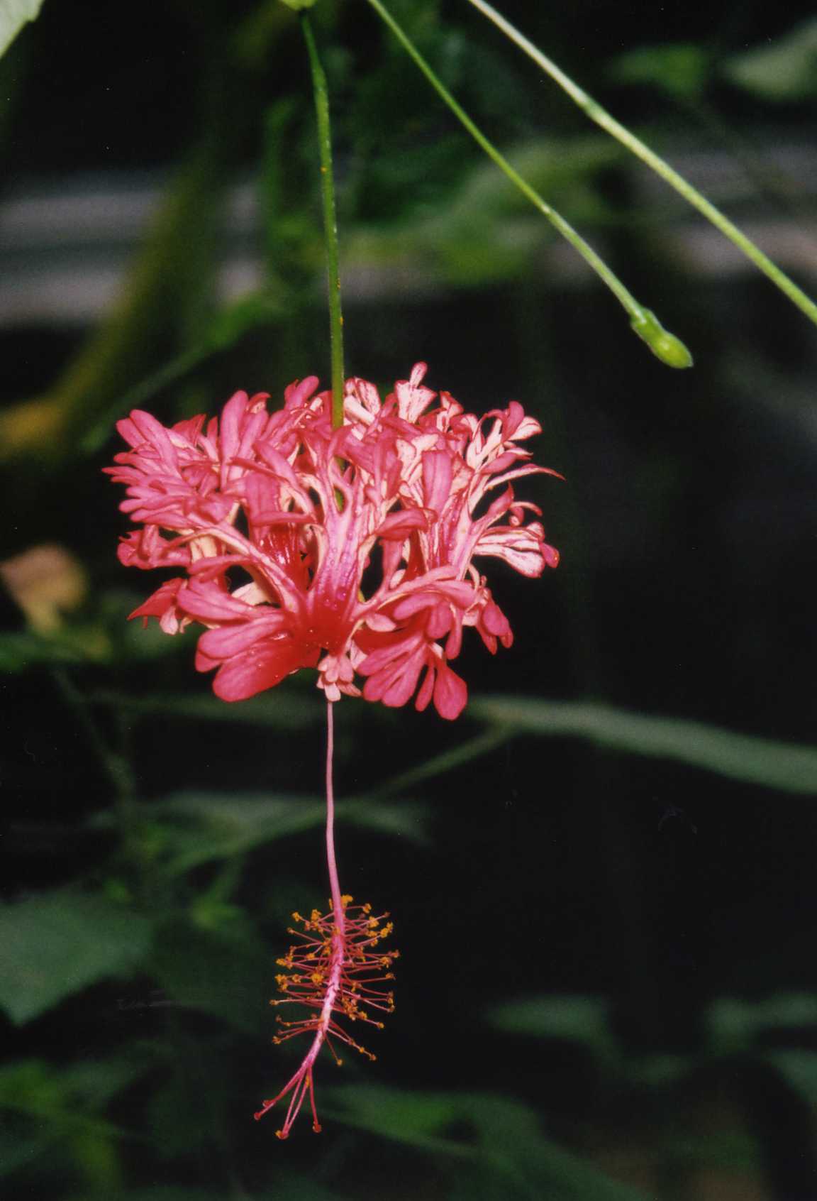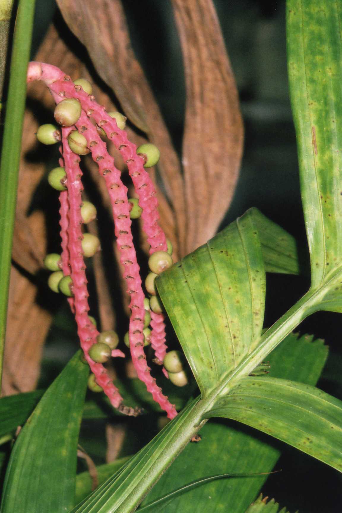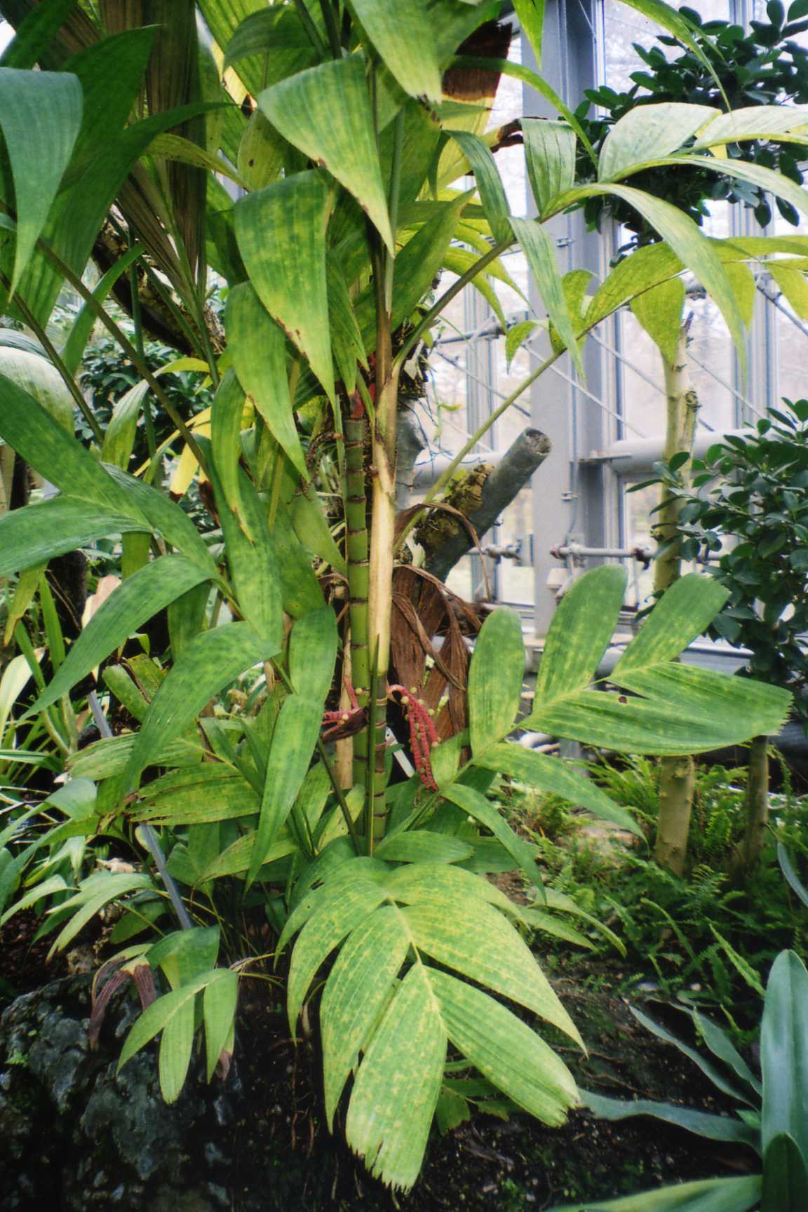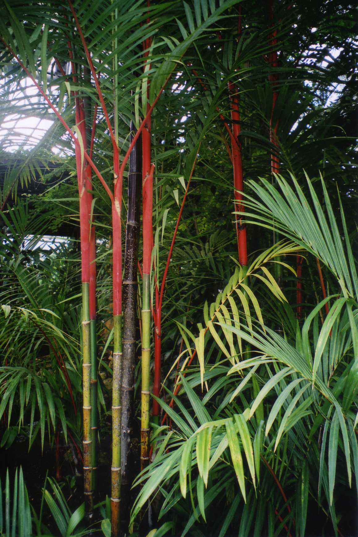 京都府立植物園で、姫猩々椰子(ヒメショウジョウヤシ)。熱帯アジアでは観賞用に栽培されているとか。葉柄や葉軸が何とも綺麗な赤。まるで竹のようだ。ボルネオ原産。