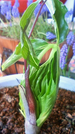 今朝、最初に出てきた浦島草の葉が完全に開いた。早く写真を載せたいけれど、機械音痴でケイタイからブログに写すのにどうしたらいいかわからない。