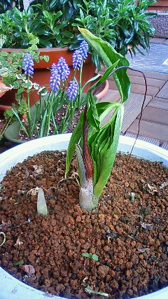 昨日の写真から更に1時間後の21日、14時25分の浦島草。バックにはたくさんのムスカリが。ムスカリも最初に買ってきて10年近くか、そのくらいか経っていると思うけれど、ひと鉢に数本だったのが、いつの間にか100株以上に増えてしまった……。花泥棒の反対で、こっそりと人の庭に忍び込んで、うちで増えすぎているものを植えたい心境。