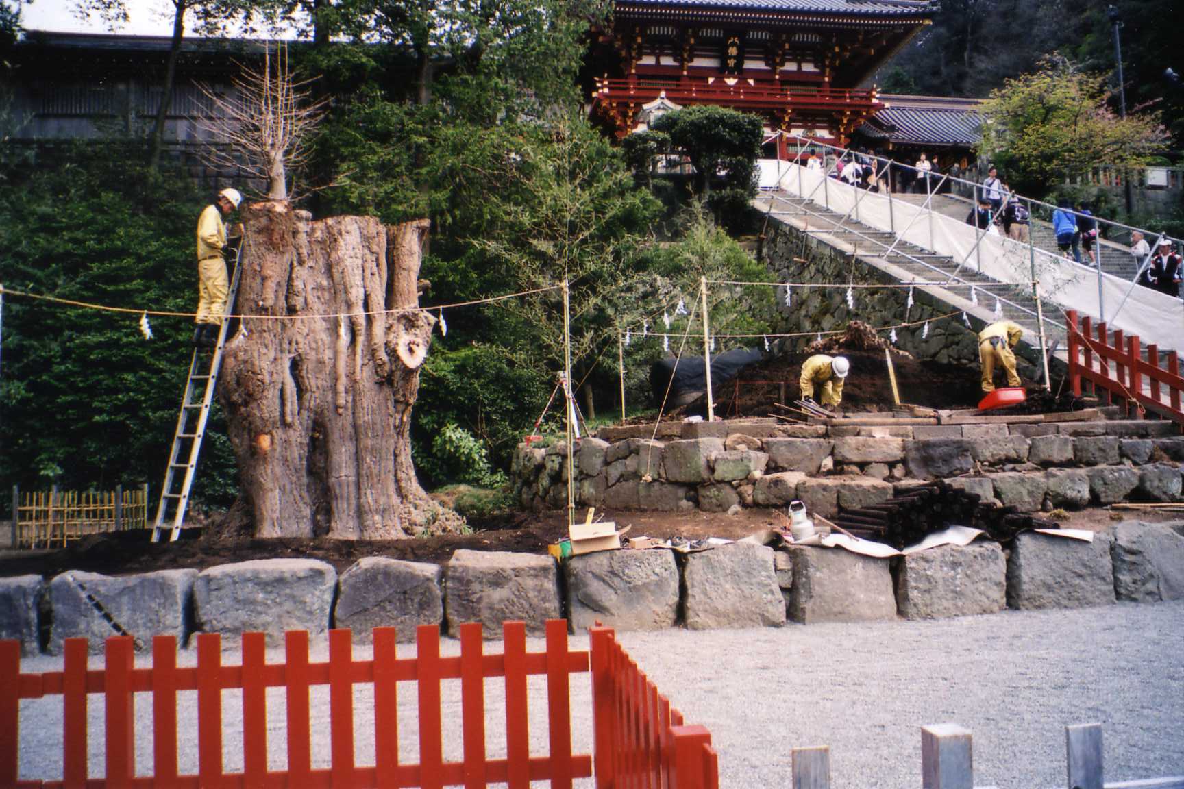 鎌倉鶴岡八幡宮の、倒れた大イチョウの植え替え作業中。