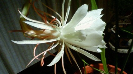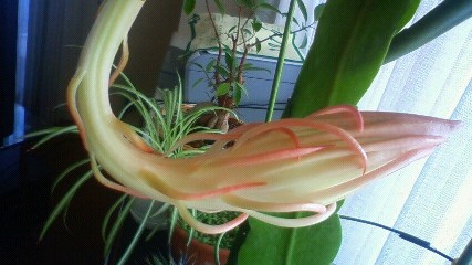 23日の燭台大蒟蒻(ショクダイオオコンニャク)。カメラで撮った写真ができ、横から。鹿児島指宿市山川の「フラワーパークかごしま」の燭台大蒟蒻はそろそろ咲くはずだ。咲いただろうか。つぼみの段階で2メートルを超していたので、小石川植物園の160センチより、はるかに大きい。近くなら見にいくのにと残念。フラワーパーク鹿児島では咲けば、夜も8時か10時まで見せてくれるようで(日によって時間変更)、サービス満点。その点、小石川植物園は商売っ気がなく、大人数に不慣れで、多くの人達が花を見ることができずに残念だった。