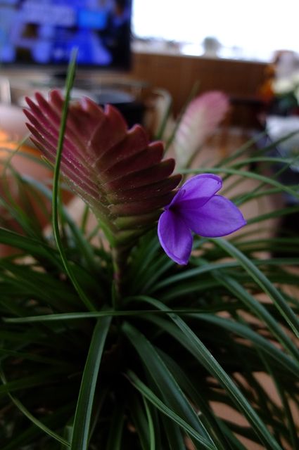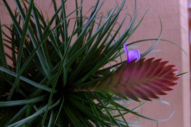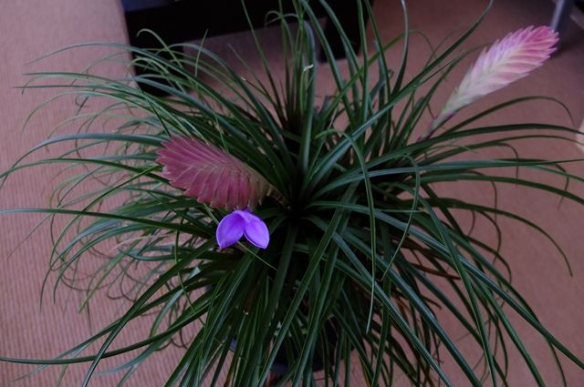 昨日、リビングの花アナナス(ハナアナナス)が咲いた。チランシア・キアネアとも言うけれど、私は花アナナスでしか覚えられない。パイナップル科なので、根はあまり成長せず、土に水やりをするのではなく、葉っぱに掛ける。葉から水分を吸収する。