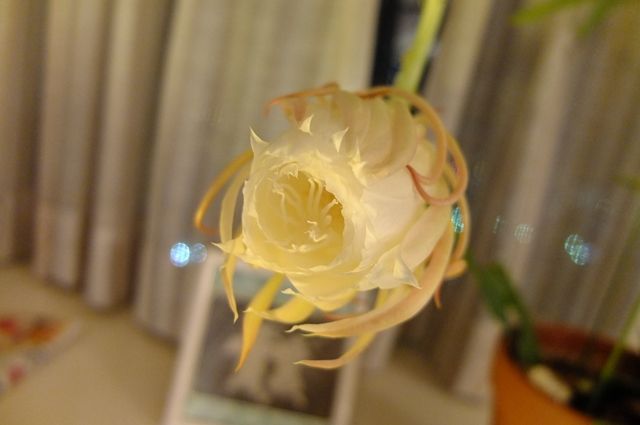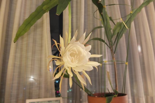 これから、葉の変形したおしゃもじのような苞のぎざぎざのところから、次々と花が咲く。苞の周囲すべてから花が咲いて終わるまで、ゆっくりだ。まだ次のつぼみが見えないので、2〜3週間は楽しめるだろう。苞は2本出ていて楽しみ。3本目も出始めている。初めて植物園で見たときは不思議な花だと見入ってしまったけれど、こうして毎年、我が家で咲いてくれるようになった。