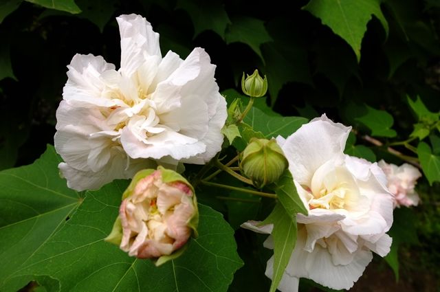 上段の酔芙蓉(スイフヨウ)は八重と言うより、獅子咲きとか牡丹咲きと言った方がいいだろうか。