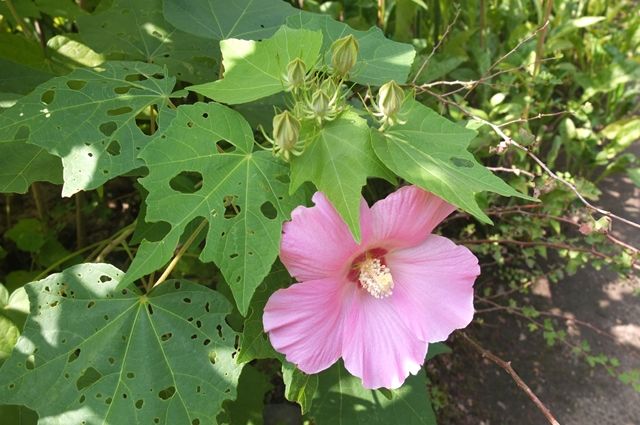 建物左脇で、風流な酸漿(ほおずき)と、右は木槿(ムクゲ)と書こうとして、あれ、葉っぱが違う……と。以前調べた気もするけれど、まったく名前が記憶にない。ギブアップと思ったけれど、アオイ科フヨウ属の矢の根梵天花(ヤノネボンテンカ)とわかった。高砂芙蓉(タカサゴフヨウ)、ミニ芙蓉の別名も。葉が矢の根に似ていて、花は梵天の形をしているからとか。名前がわかるとすっきりする。よかった。
