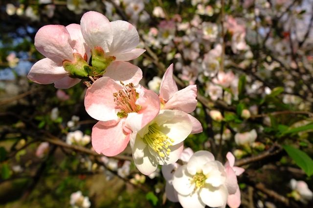 下段、本堂斜め前の木瓜(ボケ)の花。1枚目、手前はぼけているけれど、奥の花は紅白の染め分けがあって綺麗。2枚目は優しい色をしている。