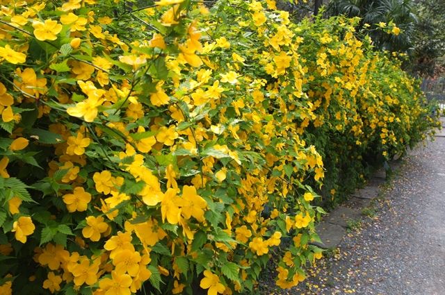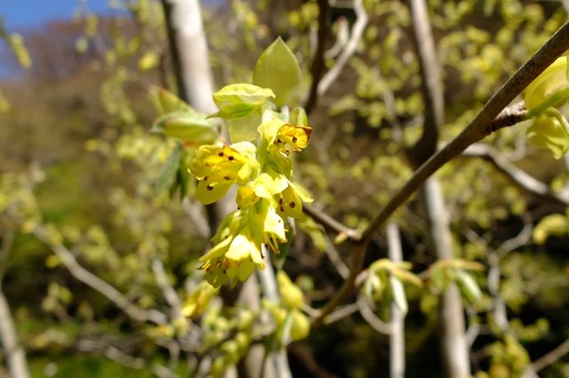 2段目の黄色い花は日向水木(ヒュウガミズキ)。上の連翹の黄色より、ずっとやさしい色。