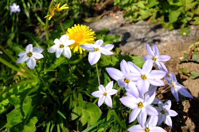 花韮(ハナニラ)も方々で咲いている。下段1枚目、花韮の中に蒲公英(タンポポ)も。花韮は白も多いけれど、私はうっすら紫ががっているこちらの色の方が好き。