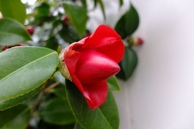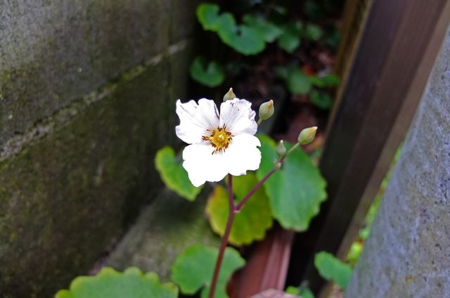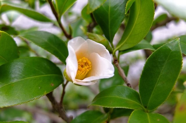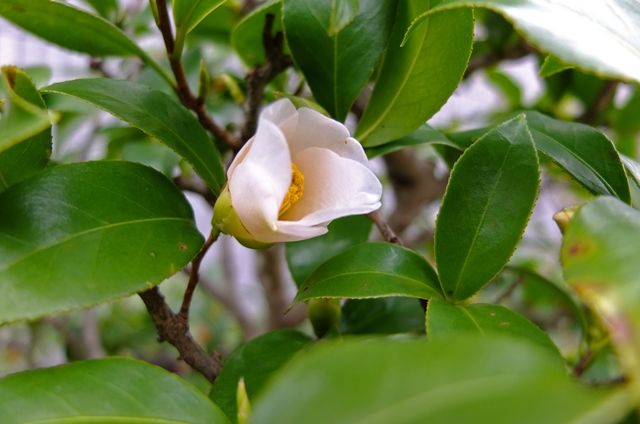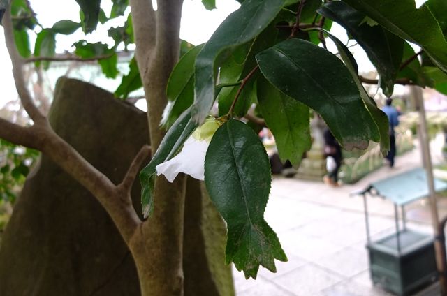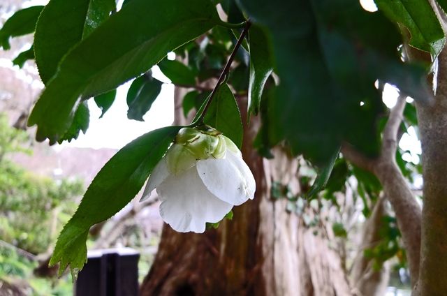 4段目、ここの錦魚葉椿の白い花をやっと見られた。今年はつぼみがついていないようだったけれど、何とか咲いてくれた。