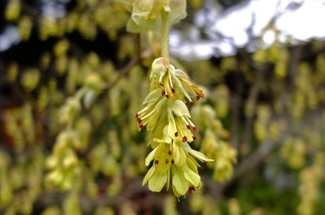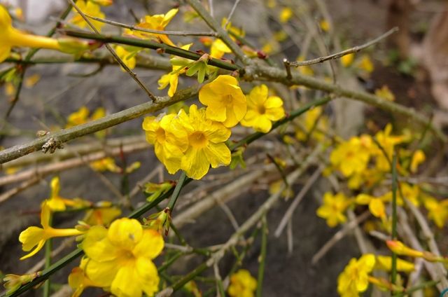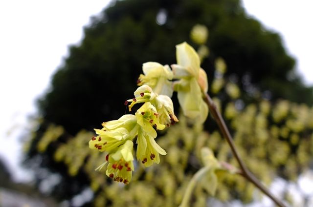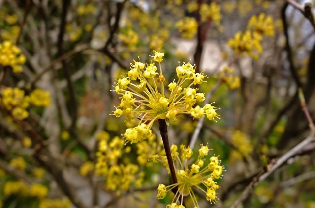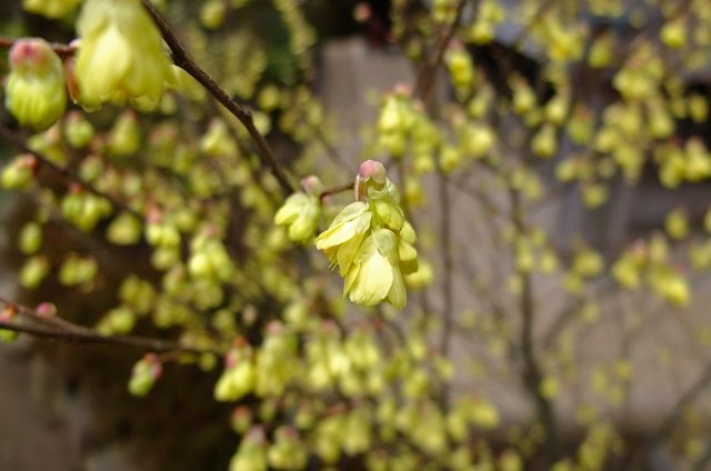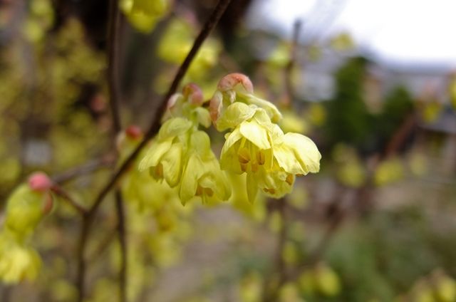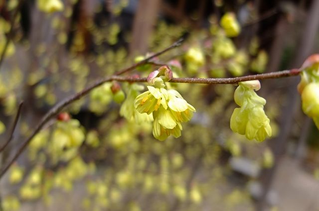 下段、咲き始めようとしている日向水木(ヒュウガミズキ)。10日、大巧寺(だいぎょうじ)の土佐水木(トサミズキ)を載せたけれど、日向水木は3つの花の集まりで小さく、土佐水木は8つ以上の花が集まって咲くので少し垂れる。