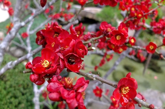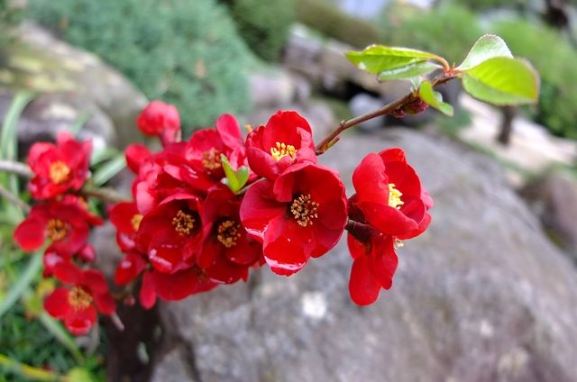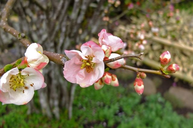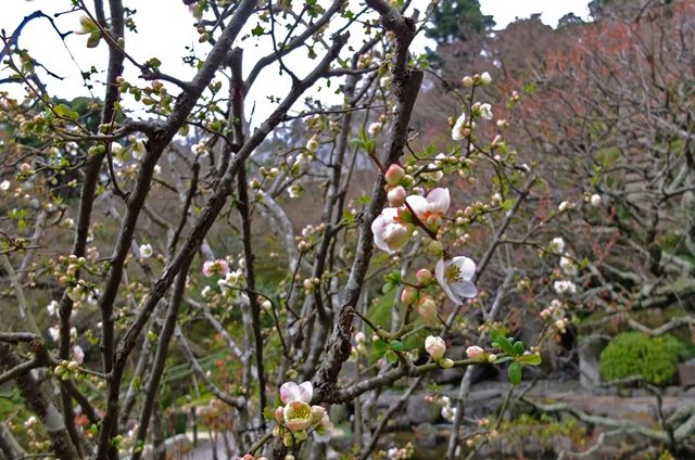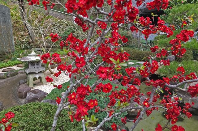 19日の鎌倉、長谷寺。1昨日載せた小高いところにある3体のお地蔵様の背後を見下ろすと放生池になっている。その通路に咲いている木瓜(ボケ)の色はやさしい。