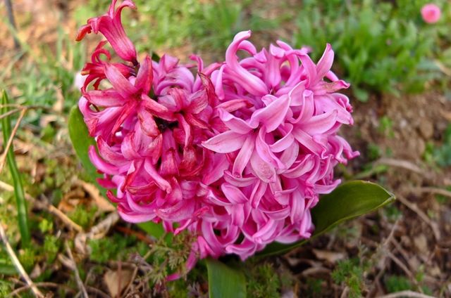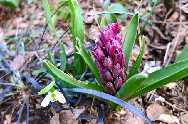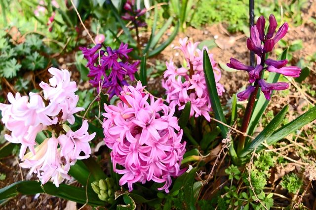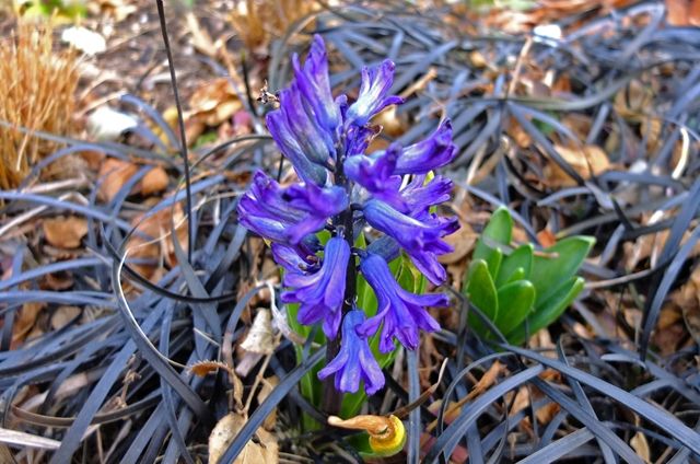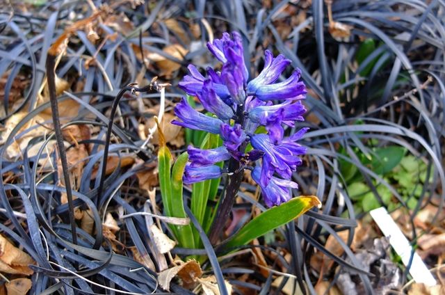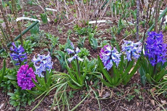 1〜2段目5枚はヒヤシンス。ここでは球根は掘り返さずに植えたままと、聞いたような気がする。ヒヤシンスのまわりの黒い植物は黒龍(コクリュウ)。大葉蛇の髭(オオバジャノヒゲ)の園芸 品種。