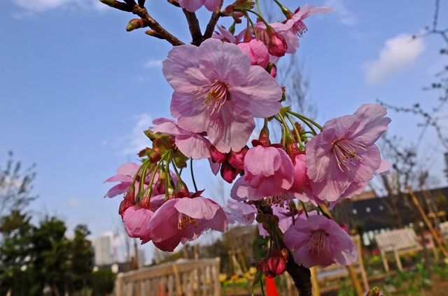 2段目、鐘楼前では寒緋桜(カンヒザクラ)が満開。