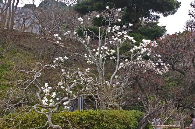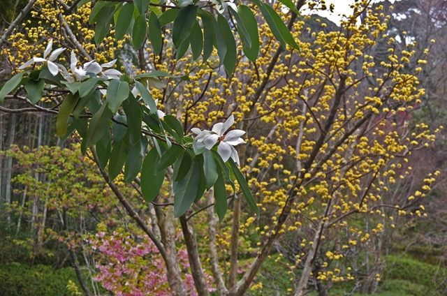 3段目、深山含笑の向こうで黄色い花をつけているのは山茱萸(サンシュユ)。ピンク色は河津桜(かわづざくら)。