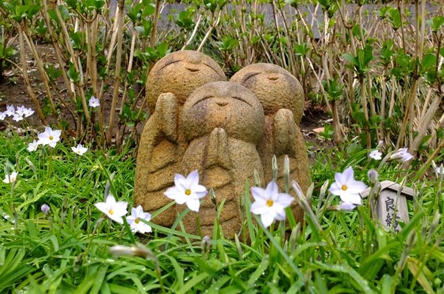 お地蔵様右奥に写っているピンク色は、最後に写っている躑躅(つつじ)。これと違う三つ葉躑躅も咲き始めているはず。