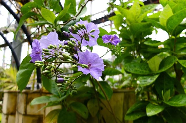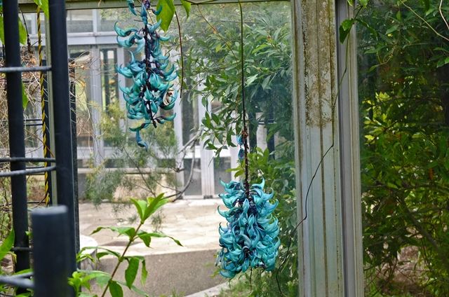 上段、翡翠葛(ヒスイカズラ)が綺麗だった。3枚目はガラス越しで外から写したもの。