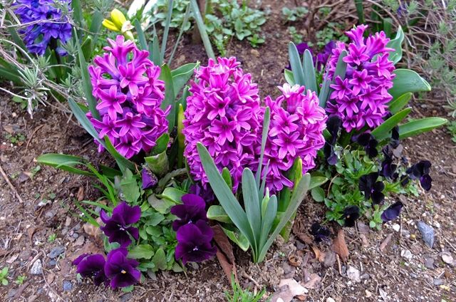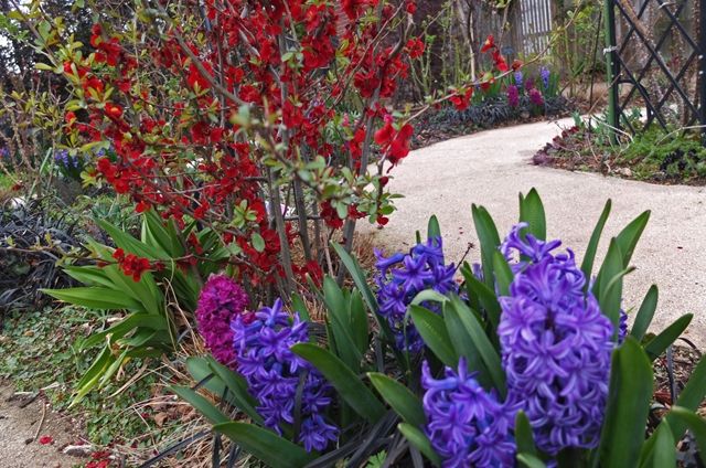 3段目、ヒヤシンス。最後の写真のヒヤシンスのバックの紅い花は木瓜(ボケ)。