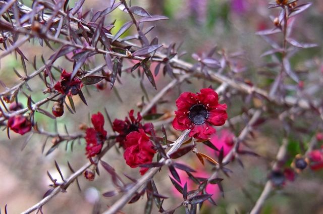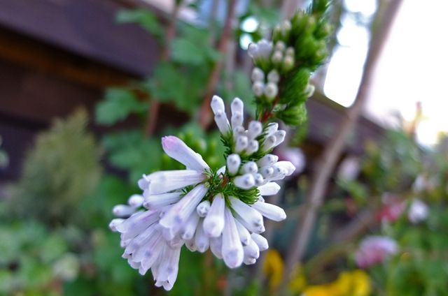 右の紅い花は御柳梅(ギョリュウバイ)。