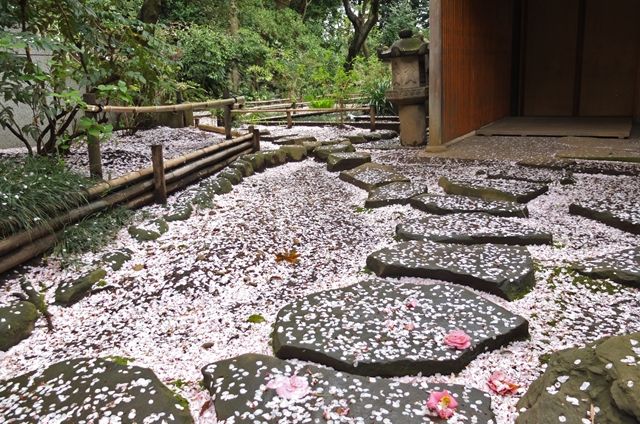3段目、頼朝の墓から寶戒寺へ向かう途中の道は桜並木。地面には花筵(はなむしろ)。水に浮かぶ桜の花びらは花筏(はないいかだ)と言うけれど、地面に散り敷かれた桜の花びらは花筵と言う。