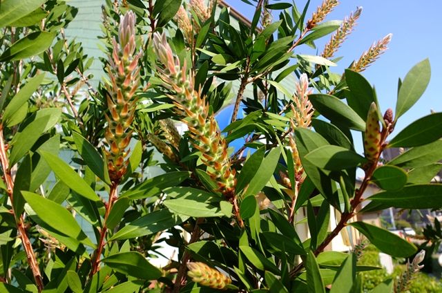 4段目は金宝樹(キンポウジュ)、別名、ブラシノキ。これも、堅いつぼみは9日。右2枚は昨日。もうじき紅いブラシが出てくるだろう。