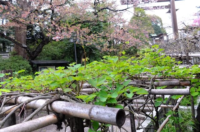 ここの三葉木通(ミツバアケビ)の花を見るのも恒例になった。6段目右は、裏参道の手水舎脇。