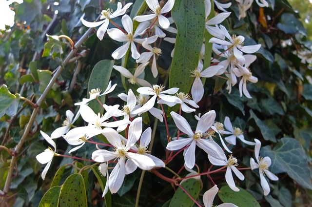 2段目左、これに似た花序がつくものが多くて、残念ながら何の木かわからない。覚えたつもりが忘れている……。右の紅い花は御柳梅(ギョリュウバイ)。
