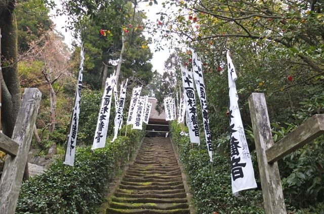 4段目、苔むした石段は今は立ち入り禁止になっており、この左手の道を歩いて本堂へ向かうことになる。5段目が茅葺きの本堂。