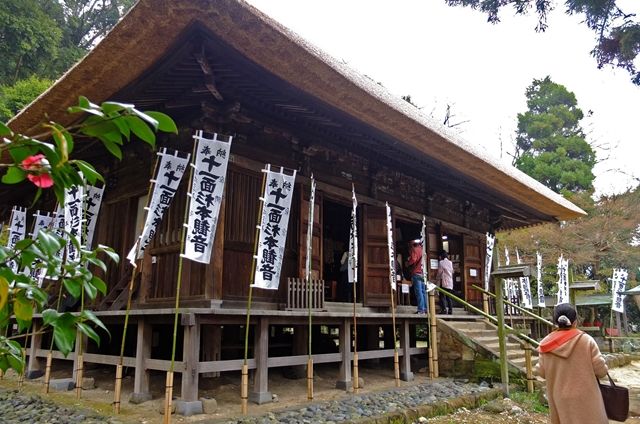 小さい堂に見えるものの、内陣中央の十一面観音後方に、棟続きの「大悲殿」と呼ばれる建物があって、御本尊の三体の十一面観音が安置されている。内陣と外陣に分けられた中世密教本堂形式とか。外から眺めるより広く、中に入ると不思議な空間に包まれる。