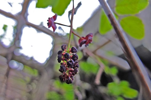 ここの三葉木通(ミツバアケビ)の花を見るのも恒例になった。
