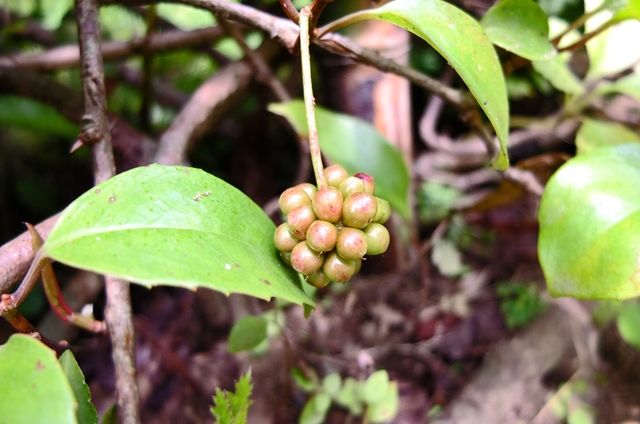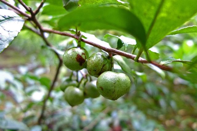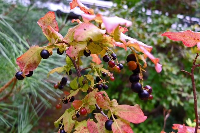 2段目左、梅擬(ウメモドキ)の実。最後は不明。