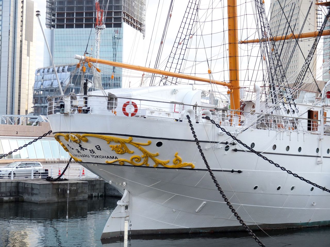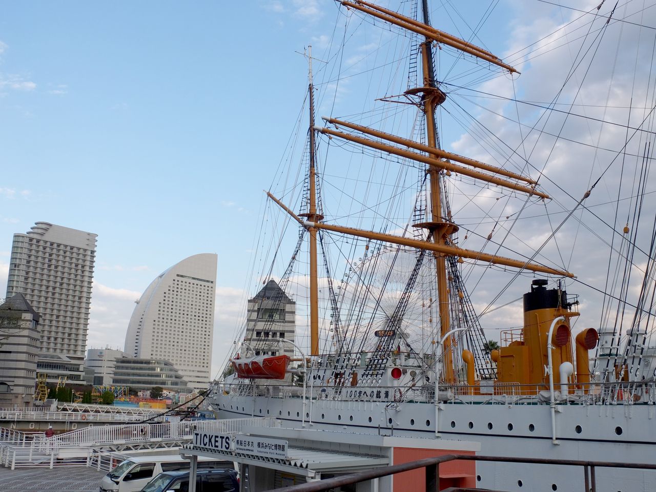掃部山(かもんやま)公園を下りて、ランドマークタワーを目指して歩いていると、日本丸の向こうに、よこはまコスモワールドの観覧車や、スイカの形のヨコハマグランドインターコンチネンタルホテルなどが見えてくる。1、4、5枚目、日本丸。