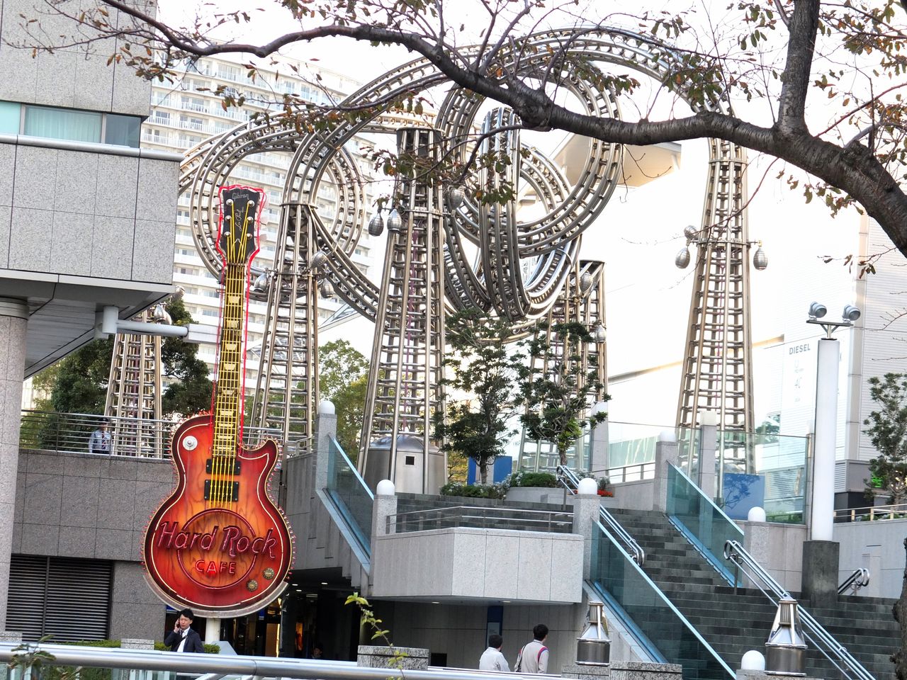 川に沿ったさくら通りを歩いていると、8枚目、ひときわ目立つ大きなギター(ネオン)のある店。ランドマークタワーに隣設する、クイーンズタワーA1階にある「ハードロックカフェ 横浜」。