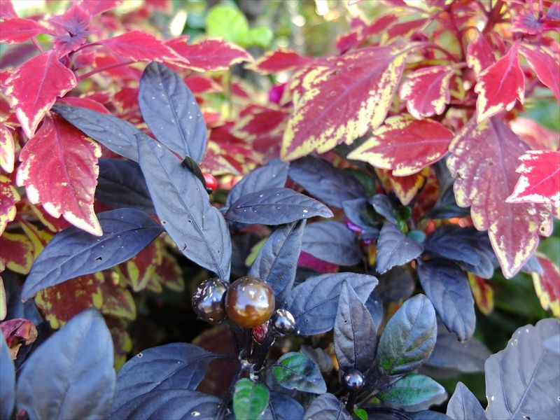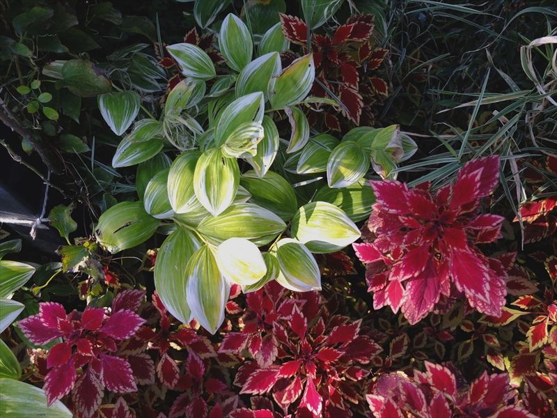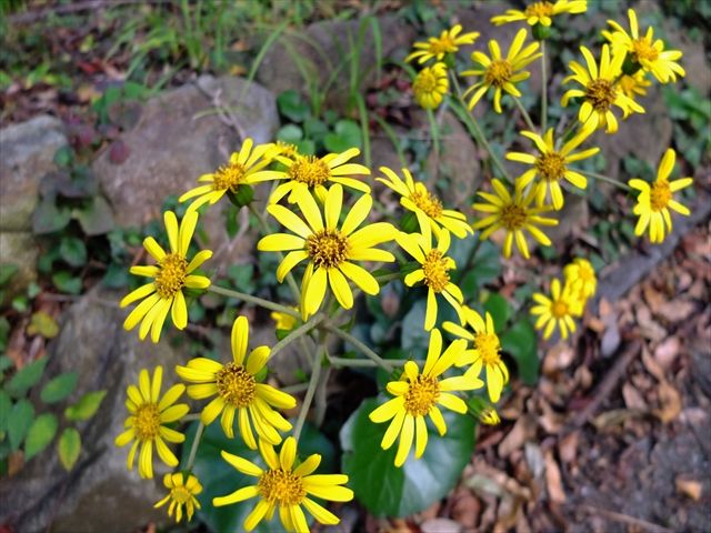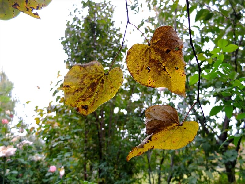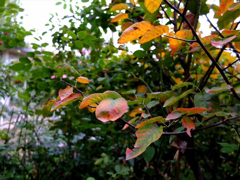 3枚目の赤く色づいているのは満天星(ドウダンツツジ)の葉。4〜6枚目の黄色は石蕗(ツワブキ)。