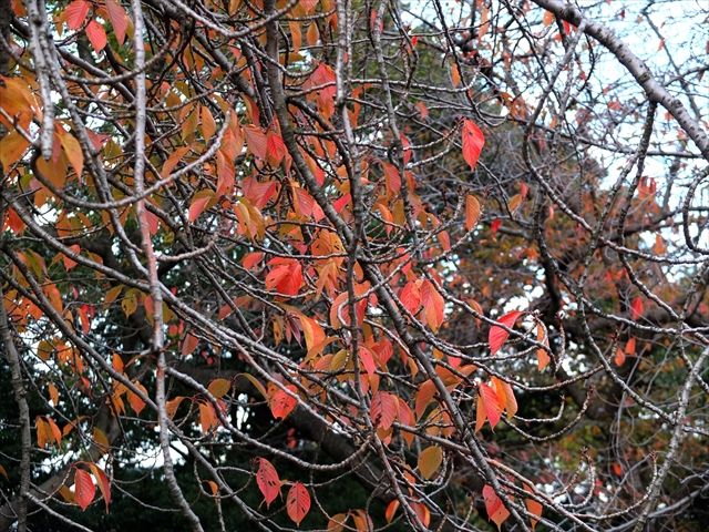 2枚目は銅像前の桜紅葉(さくらもみじ)。紅葉した桜の葉のことをこう言う。ここは桜の名所で200本の桜が植えられている。300本という説も。緑色の桜、御衣黄(ぎょいこう)は毎年の楽しみ。