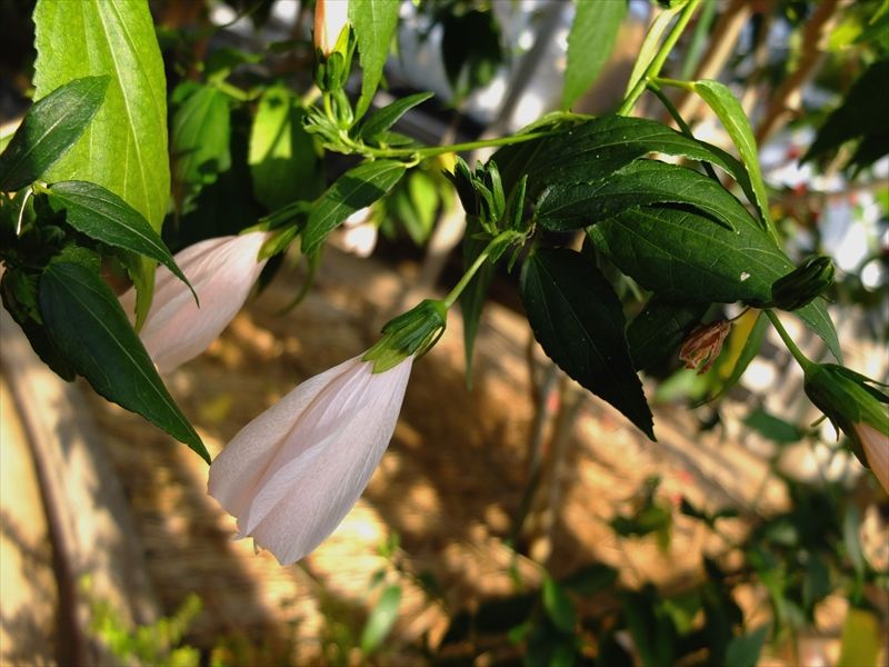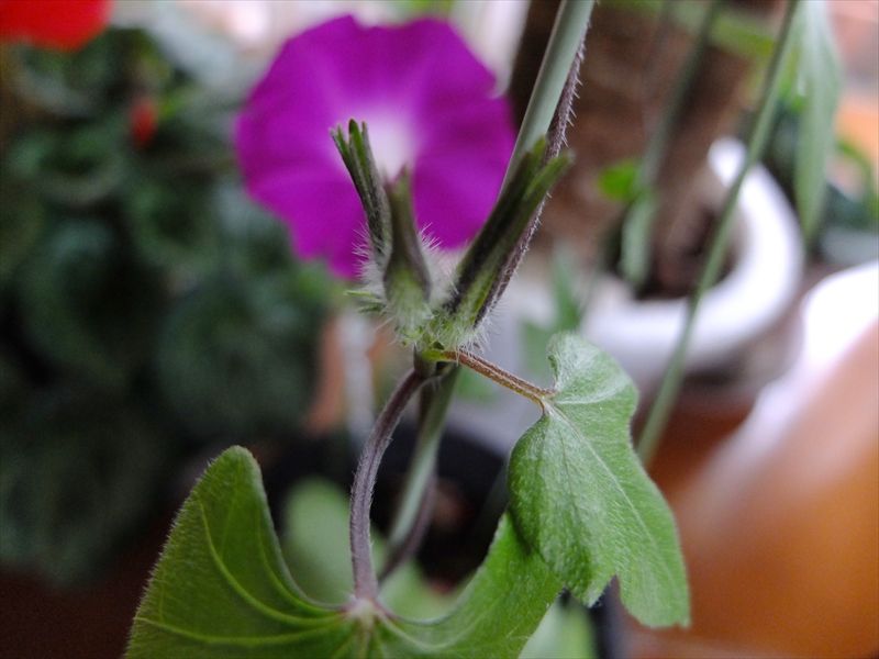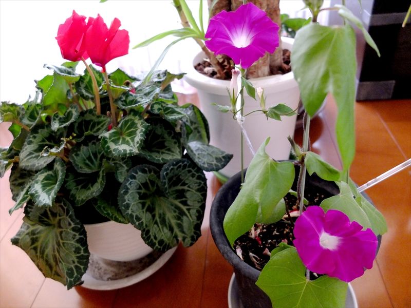 4枚目、朝顔と、咲き始めたシクラメン。シクラメンの多くのつぼみは、まだ葉っぱの下。