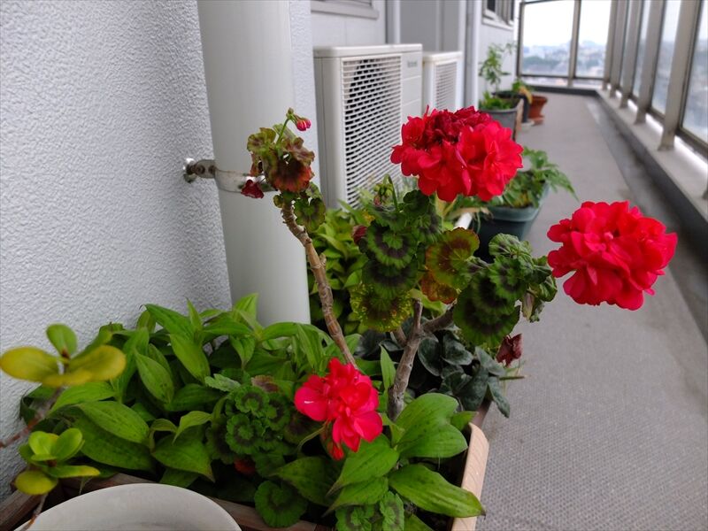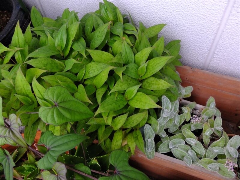 8枚目、7枚目にも写っているけれど、緑の葉が茂っているのは杜鵑(ホトトギス)。今時の葉がいちばん綺麗。これから台風などが来ると葉が目茶目茶になってしまう。花が咲くときは葉が傷ついていて、毎年、残念なことに。これも増えるので困る。右の方の白っぽいものが入った葉は、白雪姫。秋頃から咲き始めるピンクの花。最後は杜鵑と同居のゼラニウム。何年も前に友達が少し折って送ってくれたものが根づき、しょっちゅう切っているのにすぐに伸びてきて、1年中、花が咲いている。