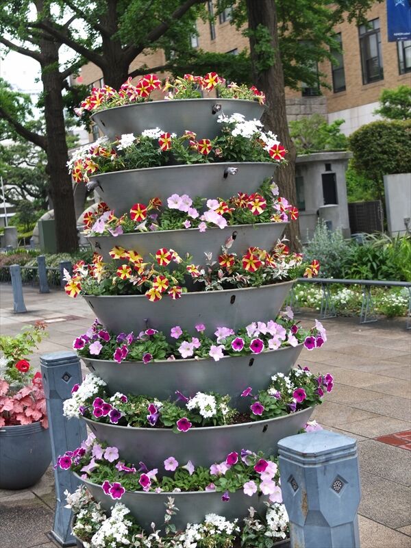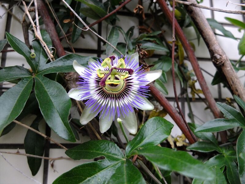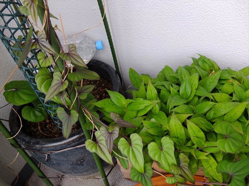 7枚目、山芋の蔓が地中から延びてきたと思っていたら、すでにこの勢い。上の階まで伸びている。3年に1度くらいの収穫。ムカゴが落ち、今では何本もになっている。左端の睡蓮鉢で育てていたけれど、ムカゴから育った別の鉢のものまで伸びてきた。