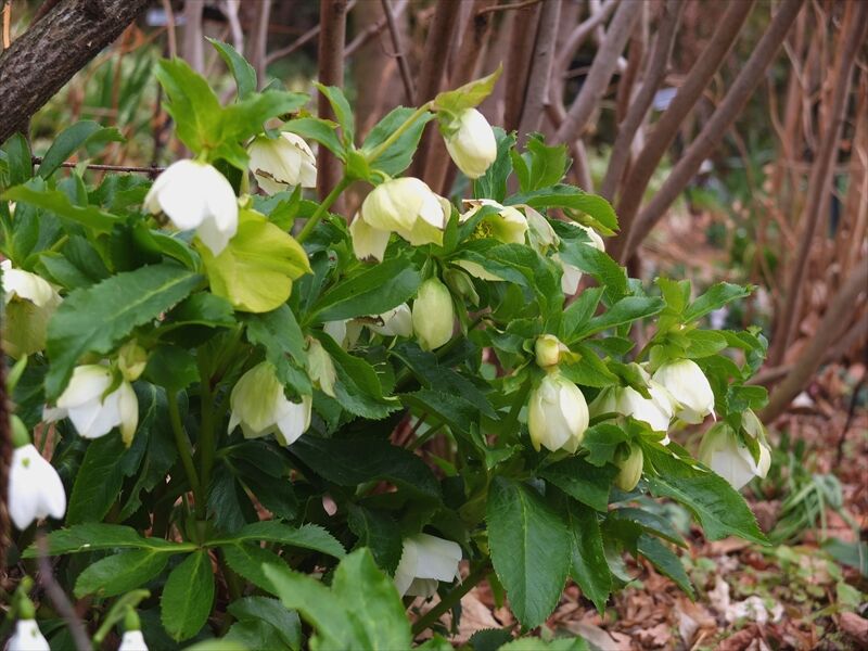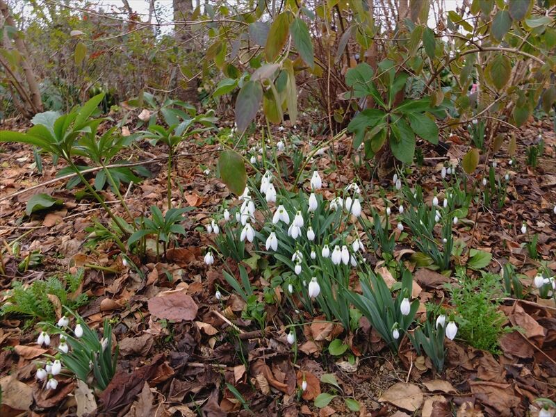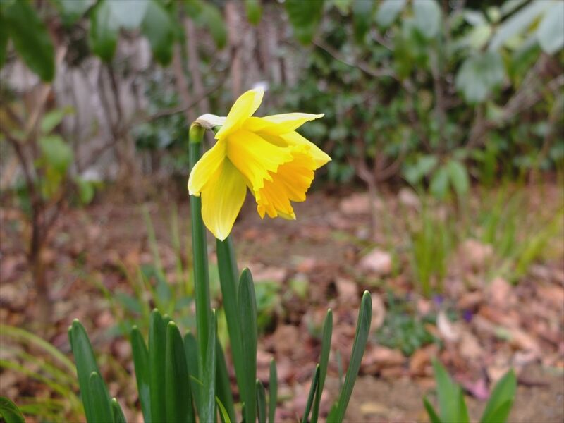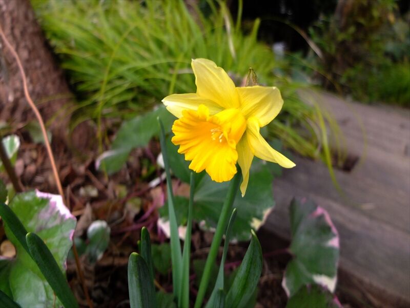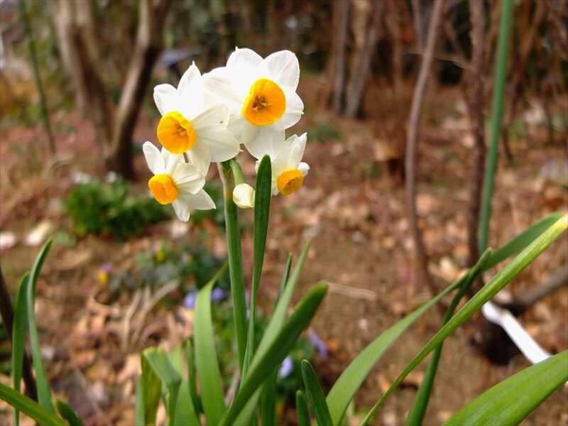 その下や近くで、5〜6枚目、喇叭水仙(ラッパスイセン)のラインベルト・アーリー・センセーション(ではないかと)や、7枚目の日本水仙(ニホンズイセン)が咲いている。