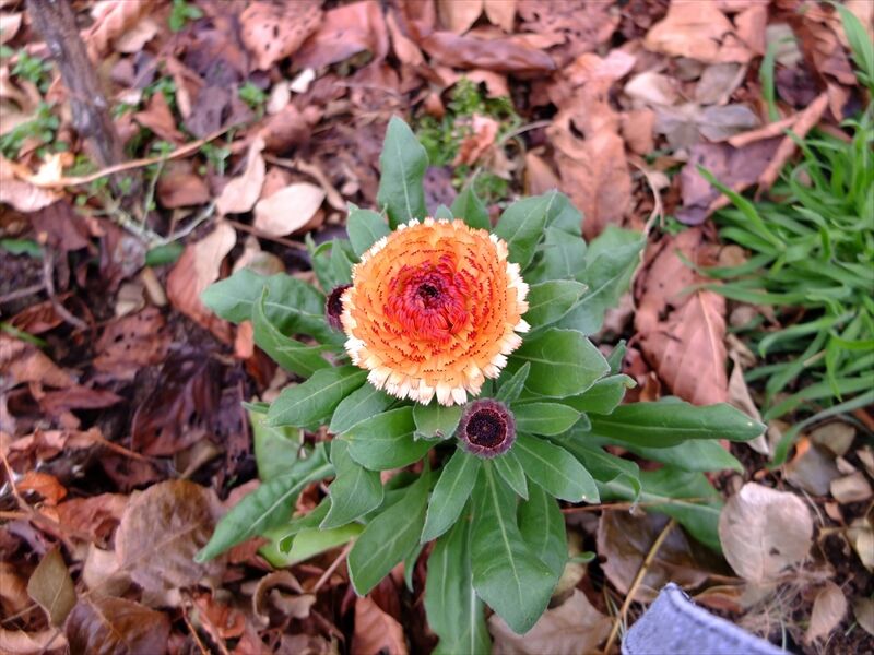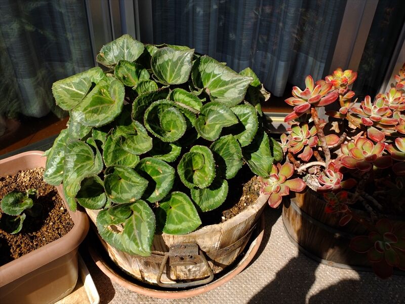 6枚目、直径40センチはある鉢に、元気なシクラメンの葉。中につぼみがたくさん。もう30年以上になるシクラメン。その鉢の左側のシクラメンは室内で育て、だいぶ大きくなったので外に出したら、強風であっという間にすべての葉が吹き飛ばされてしまって丸坊主に。室内育ちは風に耐えられなかった。今年は駄目かと思ったものの、水をやっていたら、また葉が出てきた。もしかしたら花芽もついてくれるだろうか。右側には錦光星が少し写っている。錦光星も友達からもらった1本からどんどん増えていった。