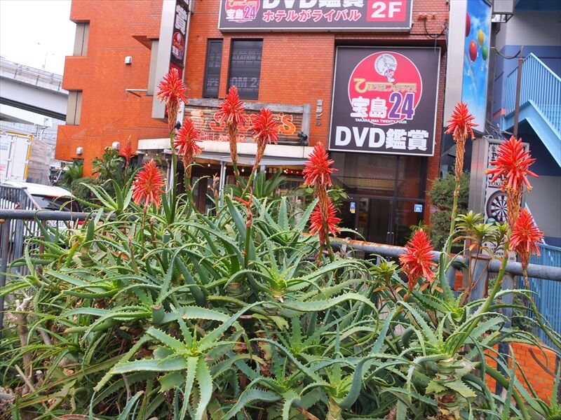7枚目、ガーデンを出て買い物に行く途中で、アロエの花。アロエは強い。地植えのものもあちこちで咲いている。我が家には苦くないアロエの不夜城があるけれど、今年は咲かないのかもしれない。