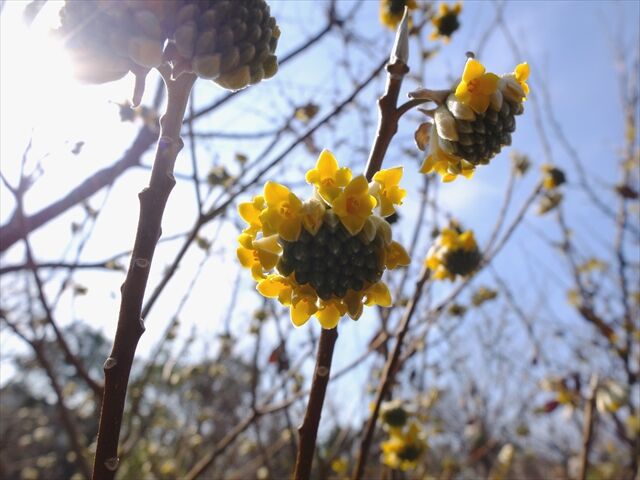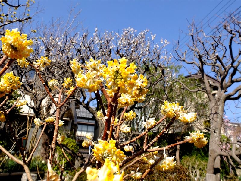 1枚目、紅花三椏(ベニバナミツマタ)と、2枚目の黄色い三椏も咲き始めたばかり。