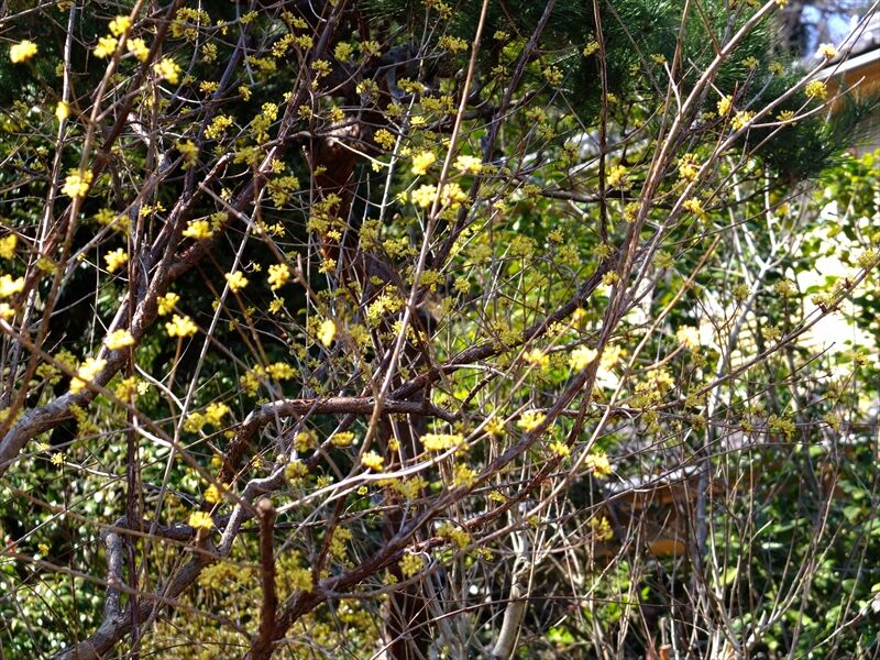 3枚目、山茱萸(サンシュユ)はこんなに開き、4枚目、福寿草もすっかり背が高くなっている。
