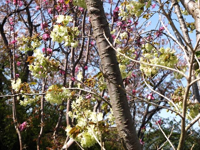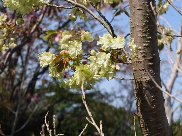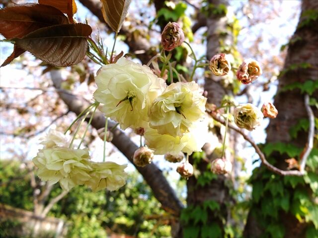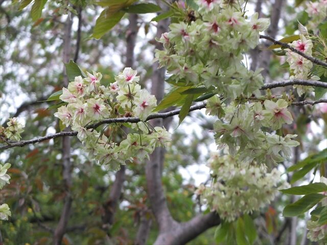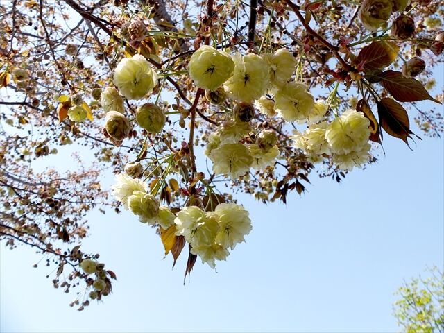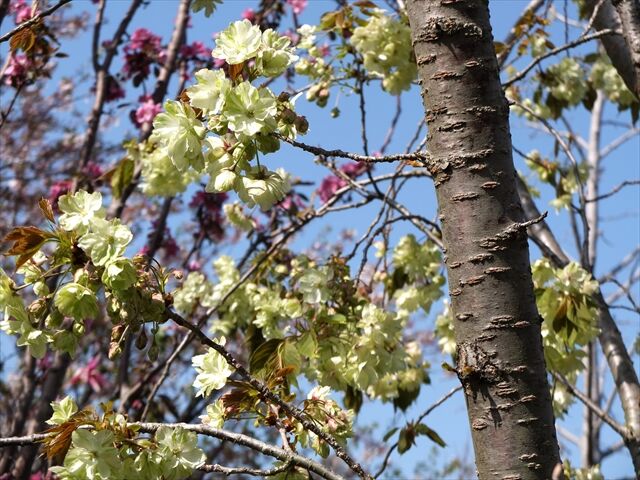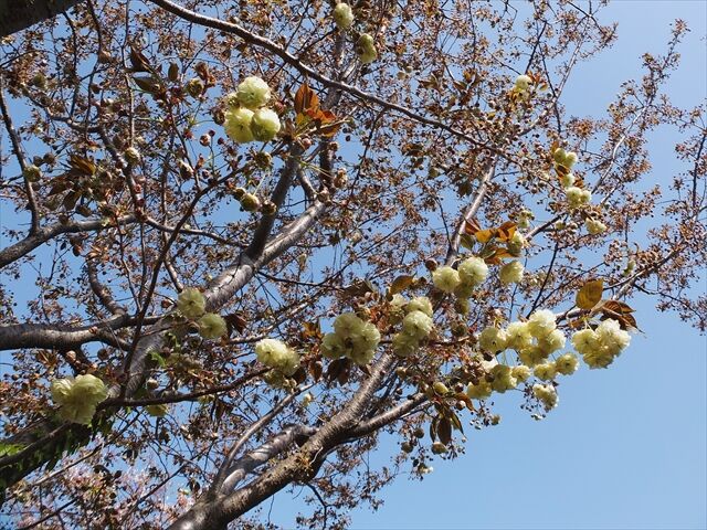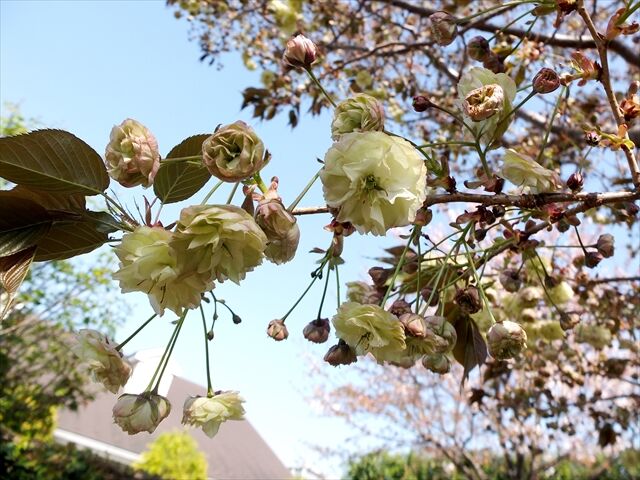 昨日載せた鬱金(ウコン)の桜もいいけれど、今日の須磨浦普賢象(スマウラフゲンゾウ)の八重の花びらの方が好み。