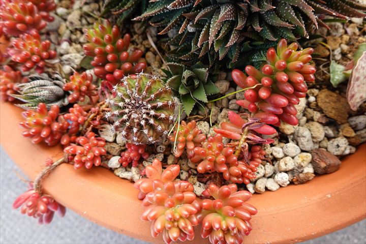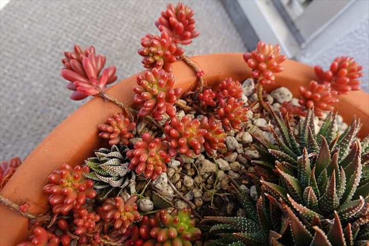 赤い珠はセダムの「虹の玉」だったか。冬場は紅葉するように赤くなるけれど、春からは緑の玉になる。これは、ひとつもぎ取って土の上にばらまいておけば根が出てきて成長していくので、いくらでも増える。ひとつが、いつの間にかこんなになってしまったけれど、たまに水やりして放っておけばいいので、管理がたやすい。