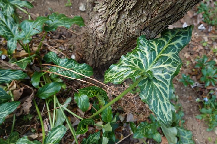 3枚目、緑濃い綺麗な葉は、アルムイタリカムだろうか。はっきりとはわからない。何と奇麗な葉だろうと、うっとり。葉っぱには興味のない人もいるかもしれないけれど、