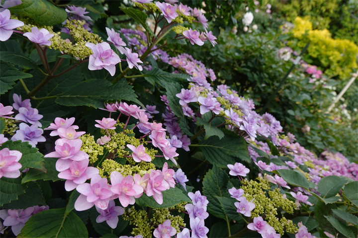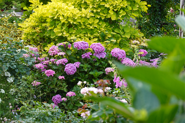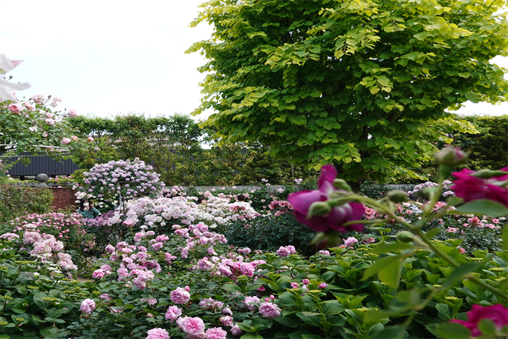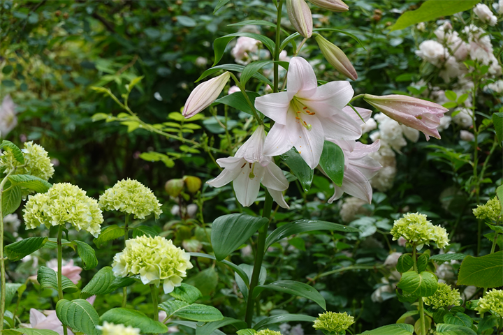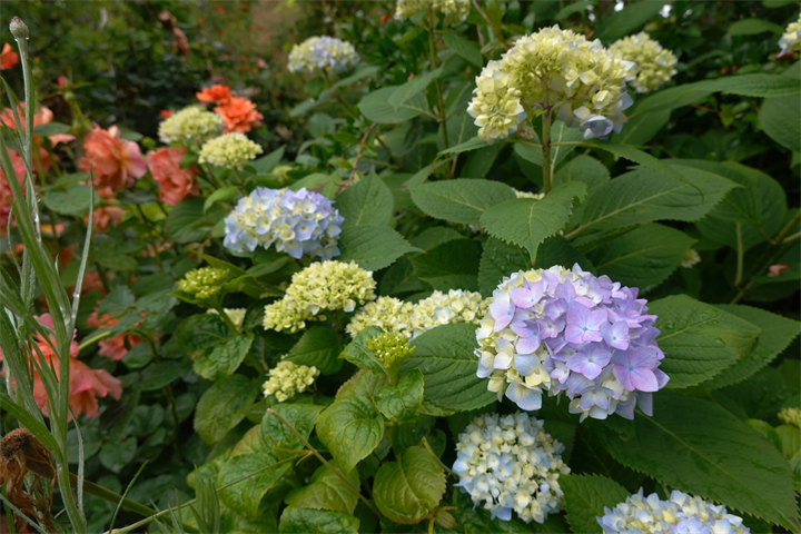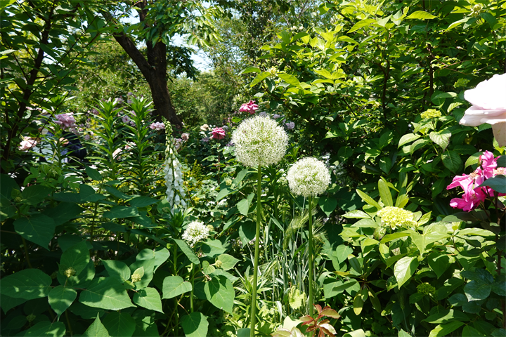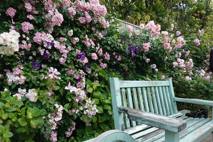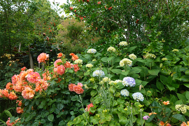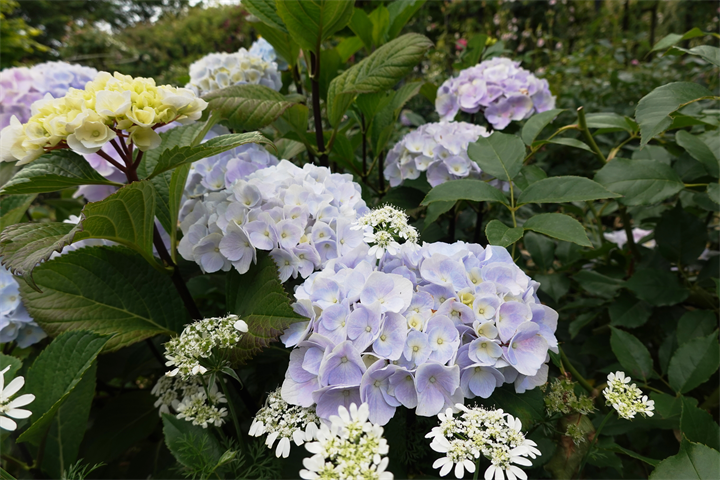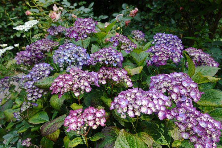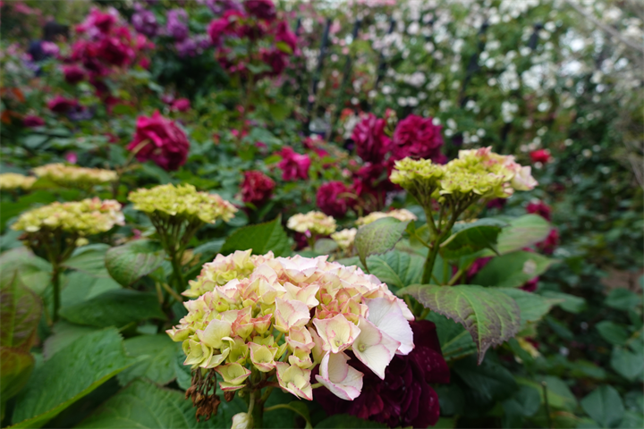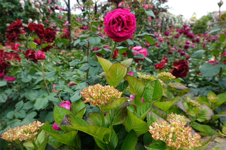 その近くで盛りの薔薇や、色づき始めている紫陽花。これから薔薇と交代していくガーデンの紫陽花も数が多くて素晴らしい。