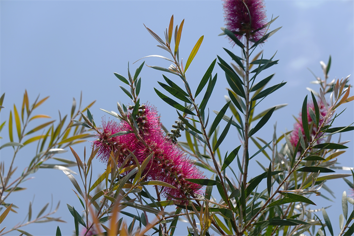 1枚目、ブラシノキは真っ赤な花が多いけれど、これはピンク。白い花もある。