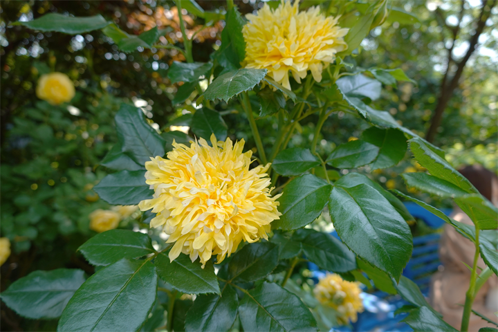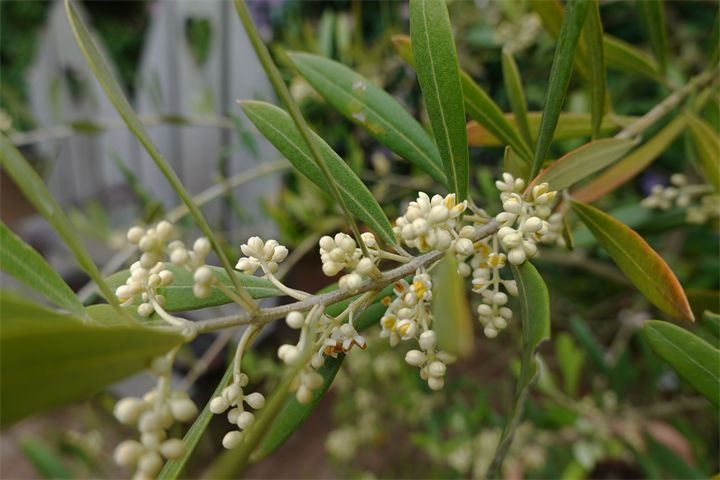 写真はまた薔薇に戻って、3枚目の椅子の右手の鉢には4枚目、オリーブのつぼみと花。